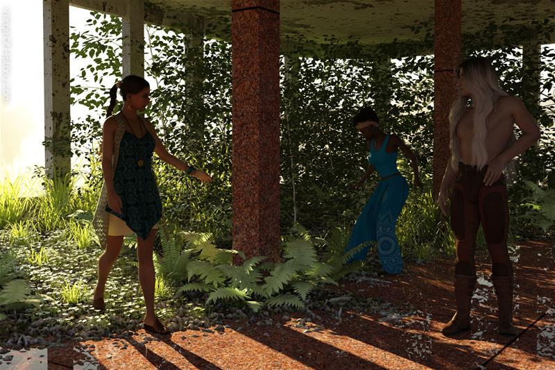 After a while Phuhak said, “Come. Let’s go walking.” He rocked forward and Renee got off his lap. He climbed out of the hot tub and reached down to help her out. Renee felt self conscious again. She looked around and sighed. She looked up at at him, smiled, and took his hand. The two walked out onto the grassy path where the others had walked earlier. She was surprised to feel that the light rain was warm. It contrasted sweetly with the cool air. They rounded the tree hand in hand.