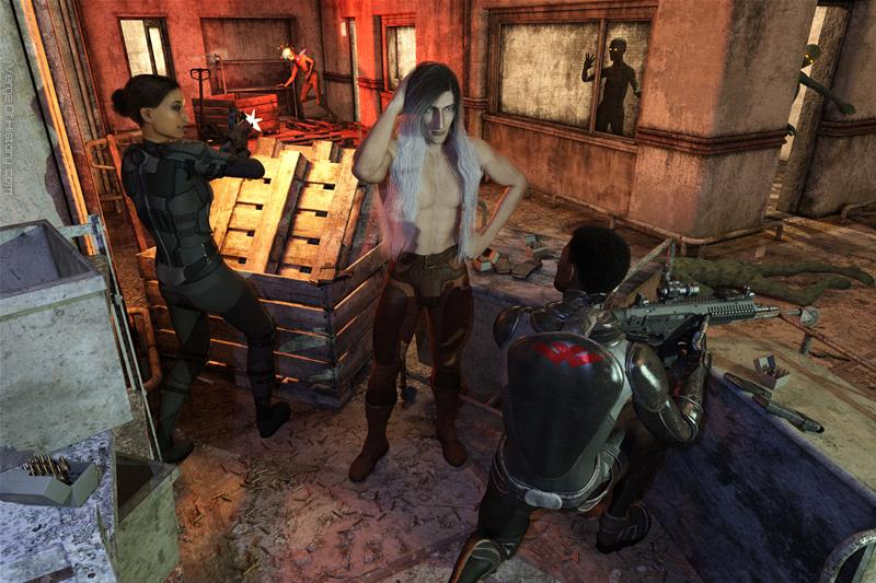 Renee couldn’t say why but she found Castor instantly attractive. At least physically. Perhaps it was his long hair. Most of its length was pure white. The roots were black or dark brown gradually fading out to white. She couldn’t quite tell the exact colors in this light. That his hair draped over his bare, muscular chest left Renee thinking he needed an electric guitar instead of his rifle and a little face makeup to completely transform him into a 1980’s heavy metal star. She caught herself staring a little too long at his chiseled face a couple times. He seemed at least superficially charming. Certainly nonchalant and confident in his skill in this game without sounding cocky.