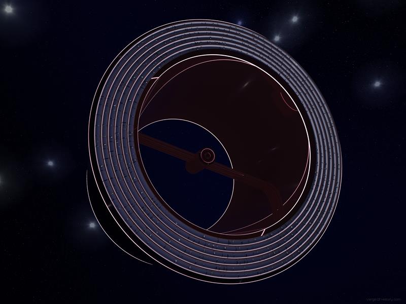 Renee had switched her view to a forward camera to watch as Aurora approached Kalju a while back. The spinner had slowly grown from a dim point ahead to a pale glowing ring. At full zoom she could now make out some of the details. Against the star studded black of space Kalju was defined first by bright white lines ringing its overall shape. Or were they pink? Sandwiched between the outer and inner light rings were six concentric rings of dimmer blue light. She could just make out figures walking around in those halos. Walkways she guessed. The center of the spinner was mostly empty space. The two light strips defining that inner tube of open space reflected off its reddish mirror-like metal surface. Two thin spokes connected a small central cylinder to the larger spinner. She could make out faint blinking lights on that central piece and figured they would be docking there.