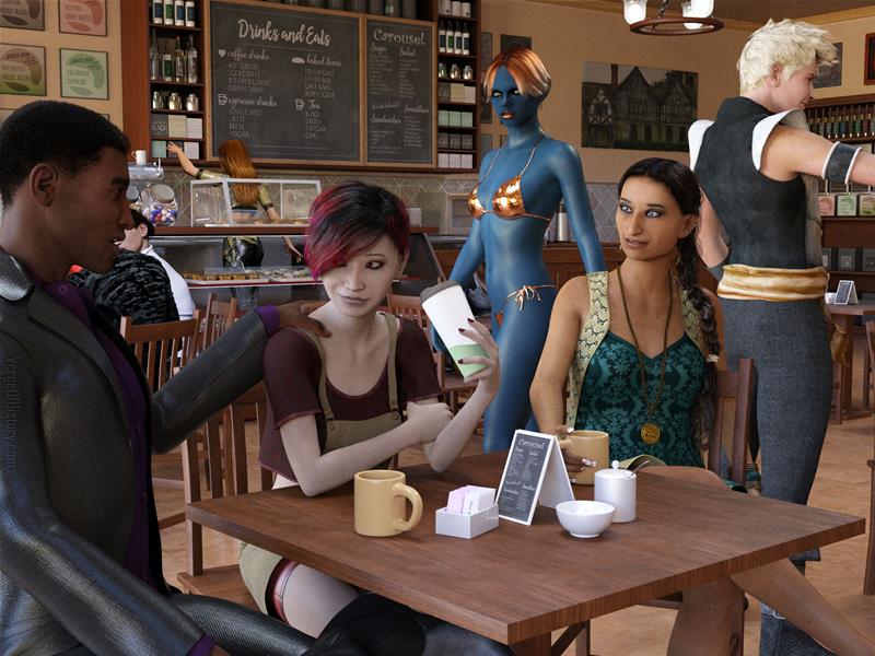 Near the top of the list Renee saw a summary for a synth called “Carousel Coffeehouse”. That sounded appealing. She spent a few minutes choosing an outfit and cursing her large new wardrobe. Thus chosen she blew out a sigh and teleported to the cafe. “Let’s do this.”