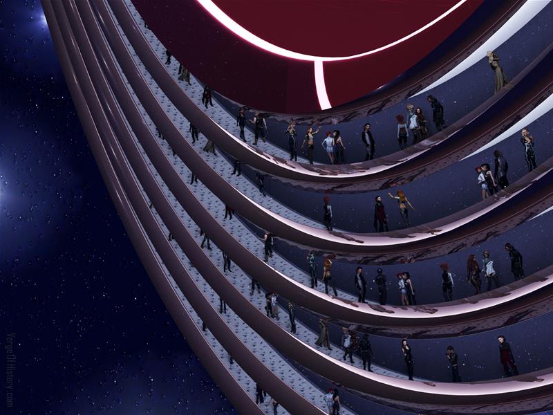 She stepped aside and leaned back against the dark blue carpeted wall that ran all along the promenade. The other side was a continuous window with no dividers or seams. It looked out on the slowly spinning expanse of space. The hallway here was maybe wide enough for three people to walk side by side. But pedestrians were strolling in both directions. Mostly staying to their right to pass others. A few people were standing up against the carpeted wall and a few more were against the window. Nobody stood in the middle of the hall because it was not wide enough to.