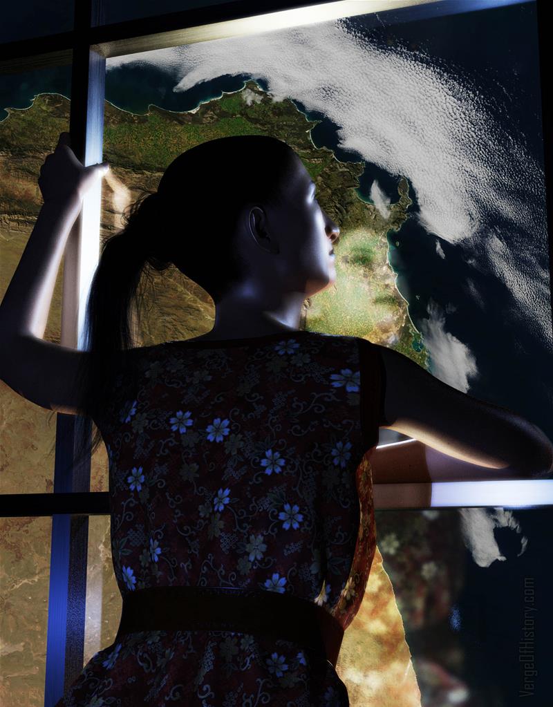 The sun slid back away and the sky turned a little, bringing into view a blue light that grew into the familiar sight of Earth. It eventually filled the sky outside. Renee craned her neck to see the edges of the planet all around. She was in awe of the sheer size of her own homeworld and yet could not meaningfully recognize anything on the ground directly below. “What is that? Africa?”