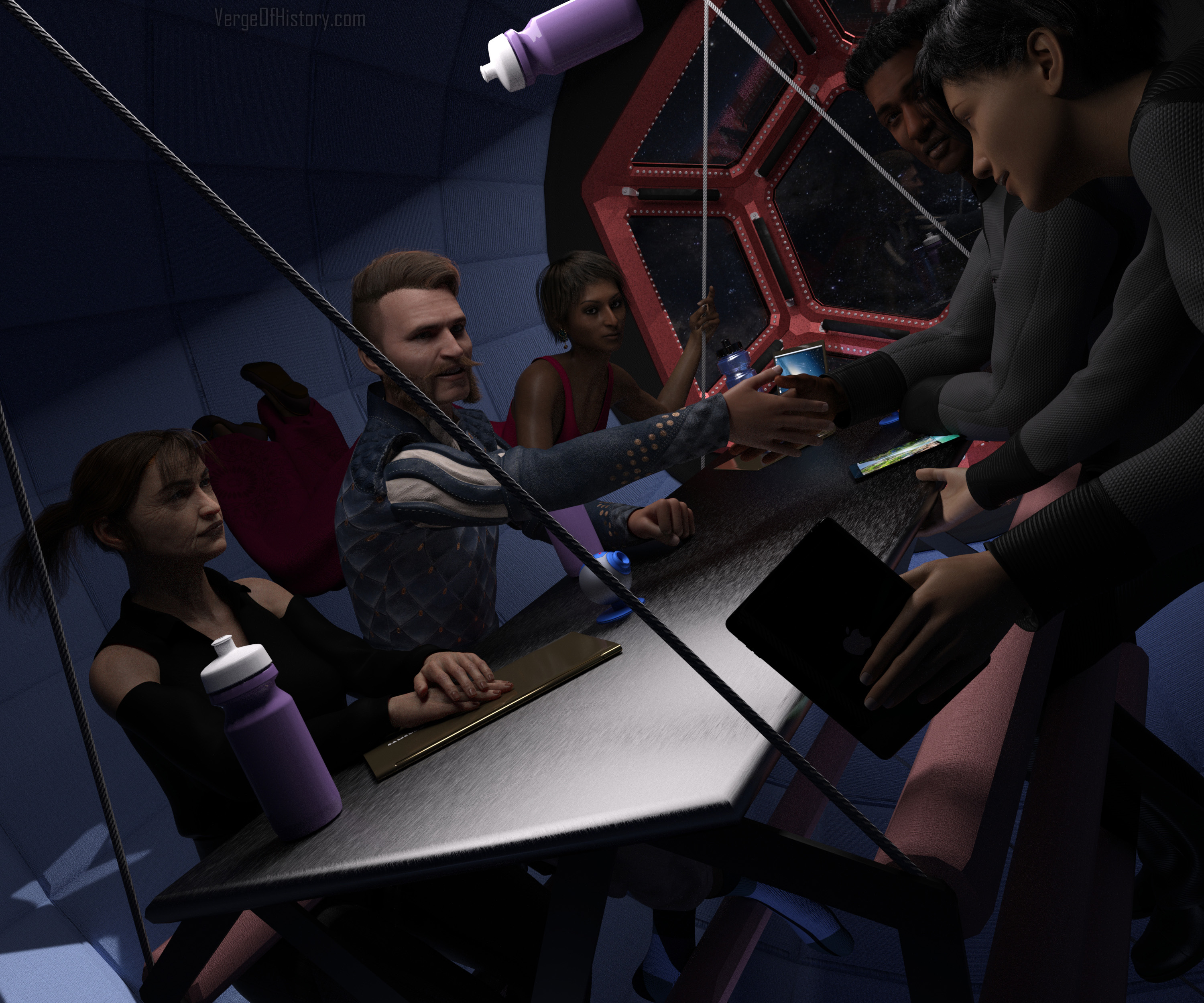 At the end of the corridor was a circular fabric wall sectioning off maybe the last third of the capsule into a conference room. Ryan stopped himself partway through the small circular doorway cut through the middle. A long steel table was suspended in the middle of the largely empty conference room by cables anchored above and below the table to the cylindrical outer wall. A couple of laptops, some water bottles, and other objects were magnetically attached to the steel table top. Greg and his VPs sat on one side of the table. “Sat” isn’t exactly the word for it though. On each side of the table were three parallel padded bars that stretched from one end to the other like picnic table benches. Each person at the table had their bellies up against the top bar. Their thighs were bent forward and fitted between the first two bars. And their knees were bent around the middle bar so the fronts of their ankles caught the lowest bar. Straightening their knees braced each person in place as securely as sitting on a bench would under gravity.