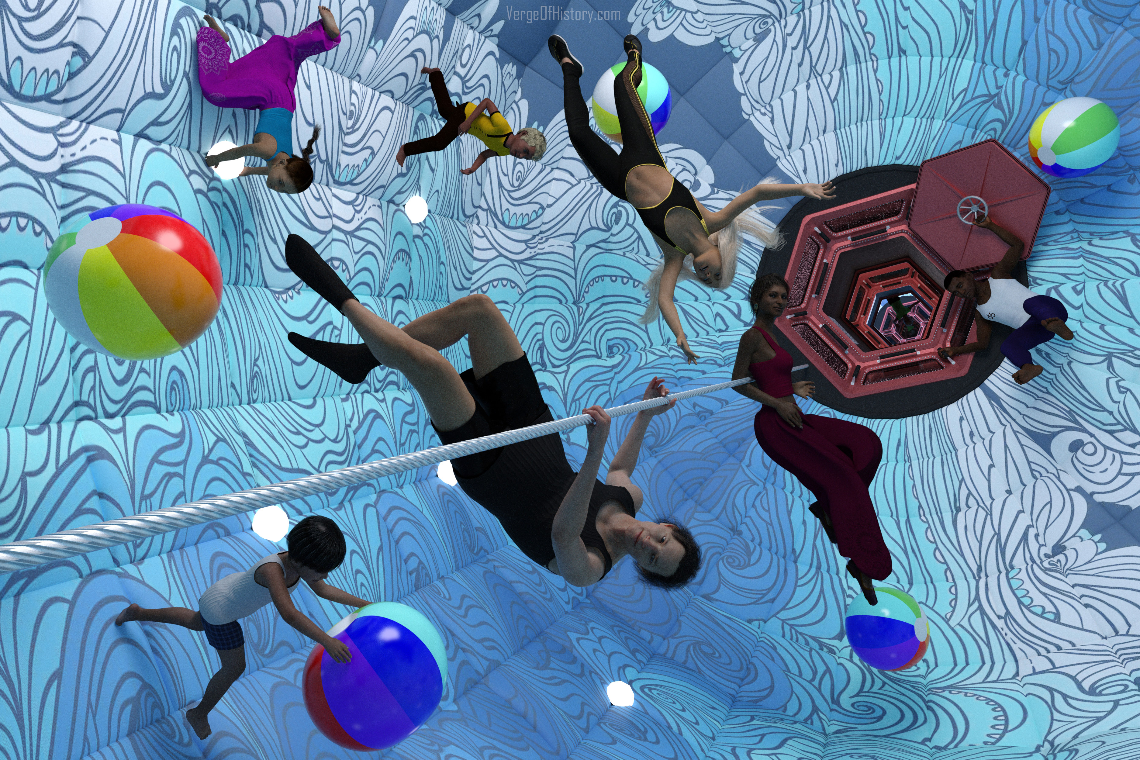 Ryan settled into his place against the floor. He sat cross-legged, pulling down on the fabric strap loop attached to it between his legs. All around the open play space capsule were others similarly settled in against the curved walls. He looked straight up and smiled at the people sitting upside-down from his perspective on the other side of the tube.